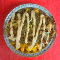 Ground Beef w/melted cheese and cheese sauce, lettuce, tomato, potato sticks, PapiVivi sauce