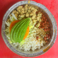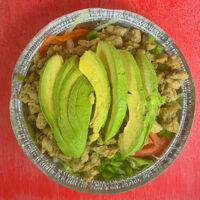 Rice&Beans/Arroz y Habichuelas, choice of meat: Ground Beef/Carne Molida, Chicken Breast/pechuga de pollo, y Pork Shoulder/Pernil, lettuce, tomato, Papivivi sauce